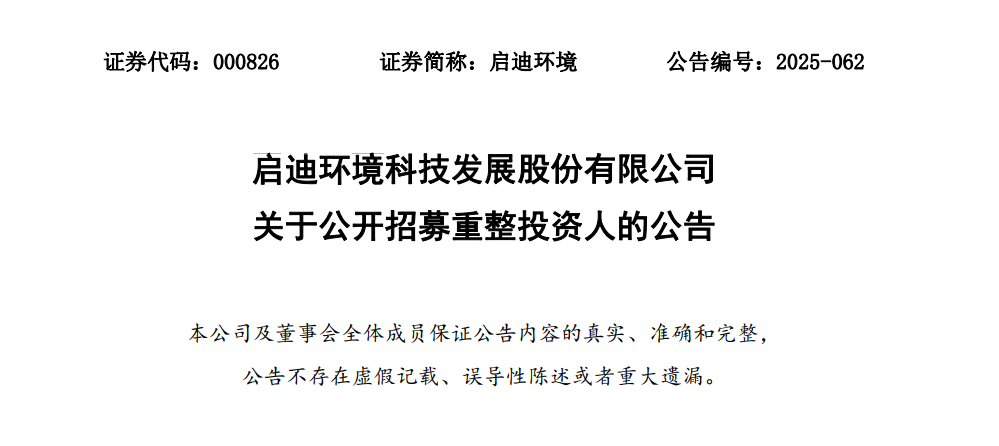 公告显示,启迪环境此次招募提交报名材料的截止时间为2025年10月28日17时,报名保证金为3000万元,流程包括初步审查、尽职调查、提交方案及递送、签署协议等步骤。