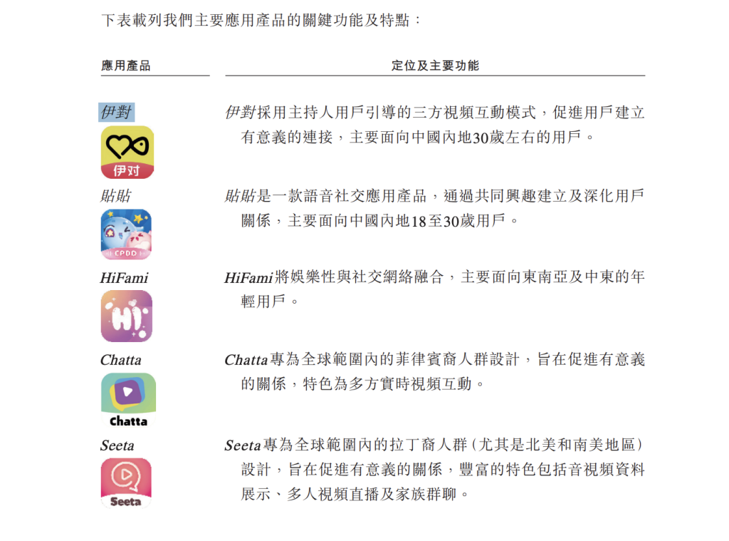 但招股书明确提示,公司大部分收入来自数量有限的应用产品,“伊对”及“贴贴”是收入的重要贡献者。若核心产品有任何负面发展均可能对本公司的整体财务及经营业绩造成重大不利影响。同时,“伊对”及“贴贴”的表现可能因法律及法规变动而受到不利影响,例如对数据安全、用户隐私或内容审核提出更严格要求;不遵守这些规定可能会导致罚款、运营限制或从应用商店下架等。风险因素不容忽视。