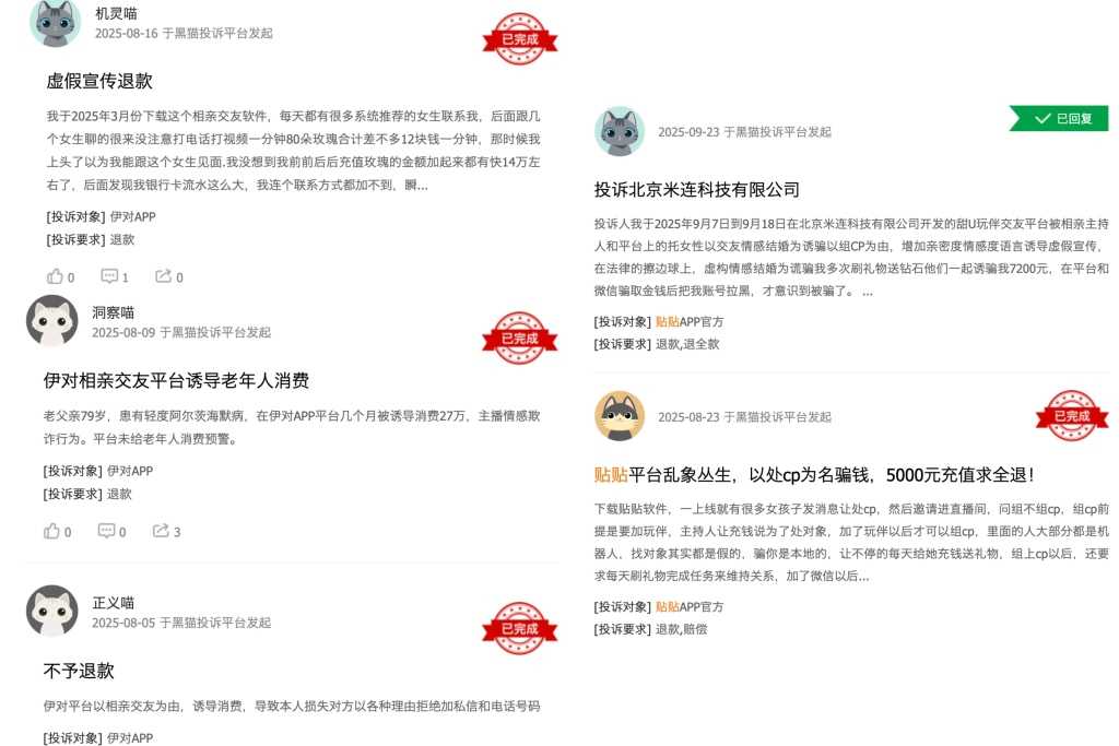 据新快报此前报道,多名男性投诉人在描述“伊对”视频相亲APP时,认为“它不是一个相亲平台,而是打着相亲的幌子直播赚钱的”。他们被APP“免费”宣传吸引,却发现视频相亲、添加女嘉宾好友均需充值送礼。有投诉人直言,相亲过程和看“女主播”直播聊天无异。唯一不同的是,在这个线上相亲房间里,还会有一个“红娘”不断诱导、催促男嘉宾“刷礼物”。这里的“红娘”正是“伊对”宣传的“主持人用户引导的三方互动模式”。招股书称,“该模式实现了高效破冰,深受那些缺乏勇气和技巧来开展并维持高质量在线互动的用户欢迎。”截至2025年6月30日,“伊对”已有累计超过18万名主持人用户。而米连科技旗下另一款APP“贴贴”也存在类似的纠纷。黑猫投诉平台上,存在多起关于“以组CP、建立关系等名义诱导消费”的投诉。社交平台规范运营待加强。