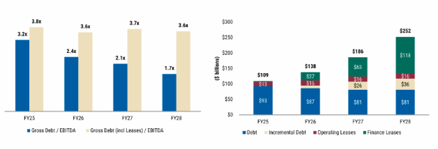 报告预测,甲骨文的总债务和租赁义务将在2028财年攀升至约2520亿美元,较2025财年末的约1090亿美元翻上一倍不止。预计在2028财年之前,甲骨文的其杠杆率(总债务及租赁/EBITDA)将持续维持在3倍以上的高位。