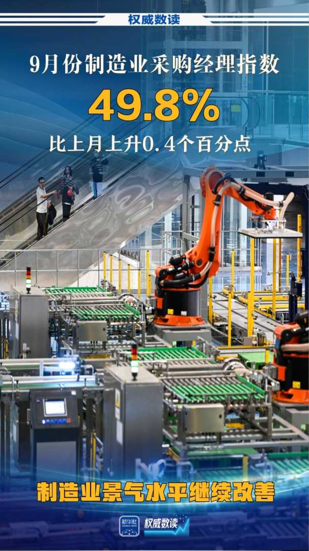 国家统计局9月30日发布数据显示,9月制造业景气水平持续改善,非制造业业务总量稳定,综合PMI产出指数高于临界点,表明企业生产经营活动总体扩张加快。