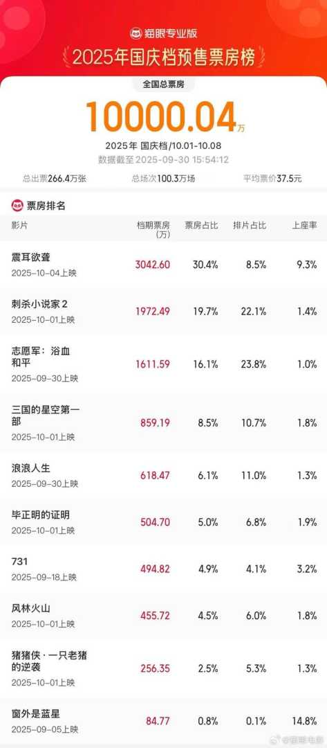 2025国庆档预售票房破亿,三部影片领跑预售榜