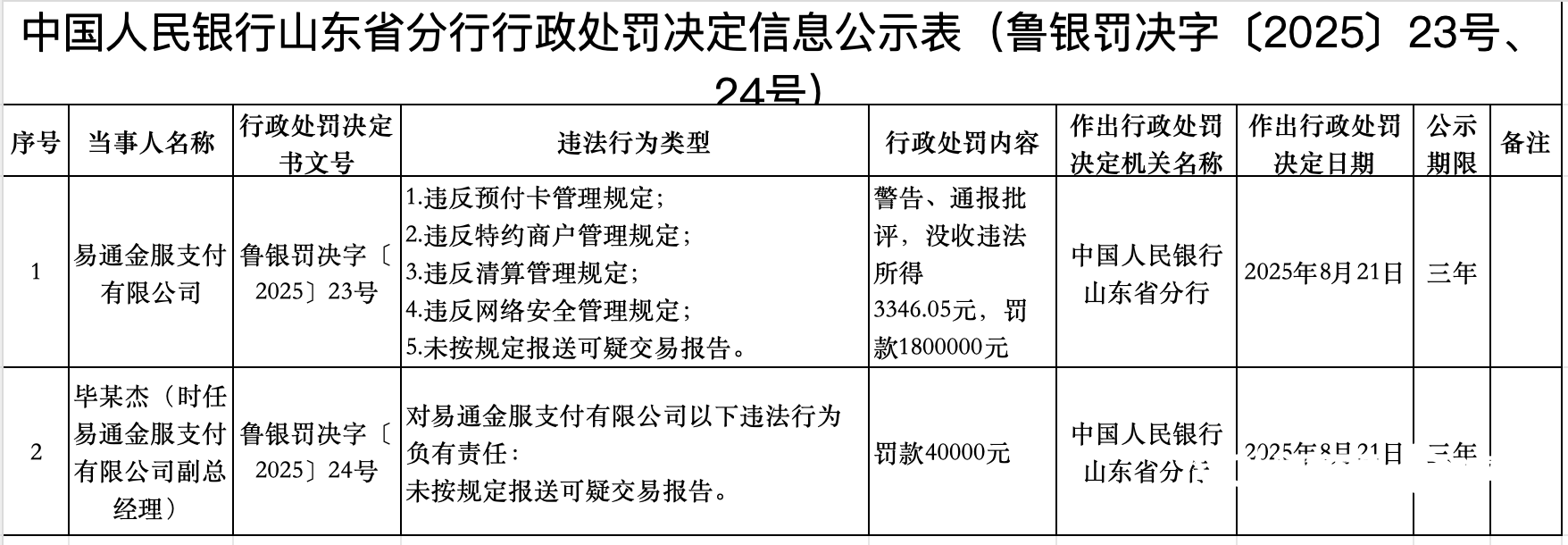 9月8日,中国人民银行山东省分行行政处罚决定信息公示表显示,易通金服支付因违反预付卡管理规定、违反特约商户管理规定、违反清算管理规定、违反网络安全管理规定、未按规定报送可疑交易报告,共5项违法行为被警告、通报批评,并没收违法所得3346.05元,罚款180万元。同时,时任易通金服副总经理毕某杰因对未按规定报送可疑交易报告负有责任被罚款4万元。