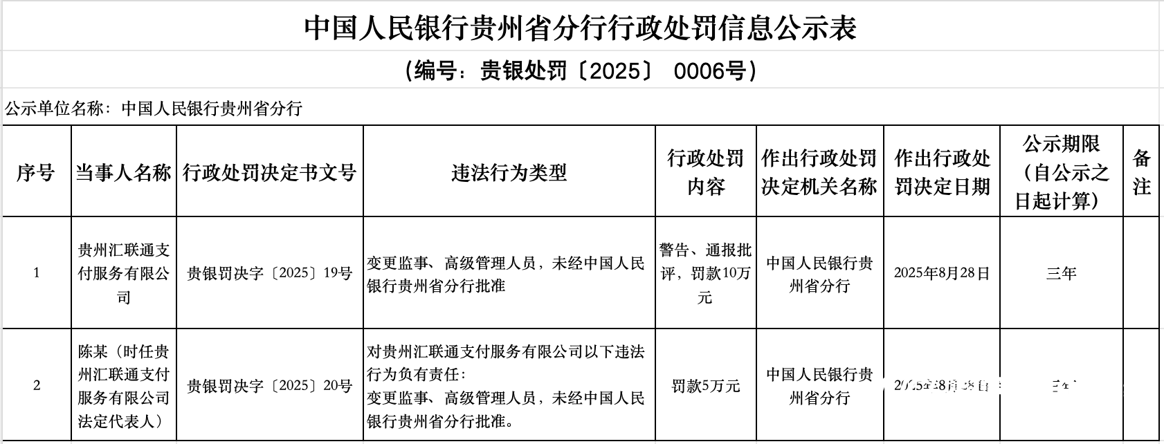 同日,中国人民银行贵州省分行行政处罚信息公示表显示,汇联通支付因变更监事、高级管理人员未经中国人民银行贵州省分行批准,被警告、通报批评并被罚款10万元。时任汇联通支付法定代表人的陈某对上述违法行为负有责任,被罚款5万元。