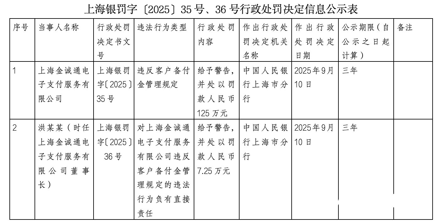 9月19日,中国人民银行上海市分行发布的罚单显示,上海金诚通电子支付因违反客户备付金管理规定被警告,并处以罚款125万元。同时,时任上海金诚通电子支付董事长洪某某因对以上违法行为负有直接责任,被警告并处以罚款7.25万元。
