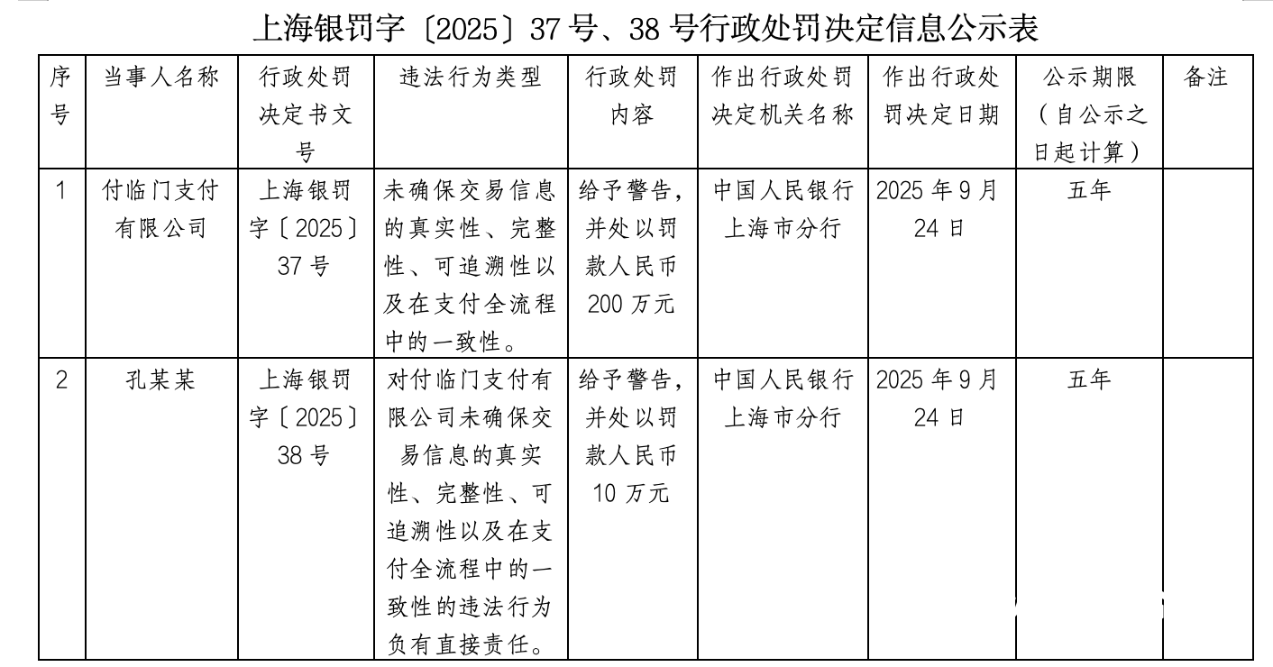 9月26日,人民银行上海市分行行政处罚信息显示,付临门支付因未确保交易信息的真实性、完整性、可追溯性以及在支付全流程中的一致性,被给予警告,并处以罚款人民币200万元。孔某某对上述行为负有直接责任,被给予警告,并处以罚款人民币10万元。值得一提的是,这是本月罚金最高的一张罚单。
