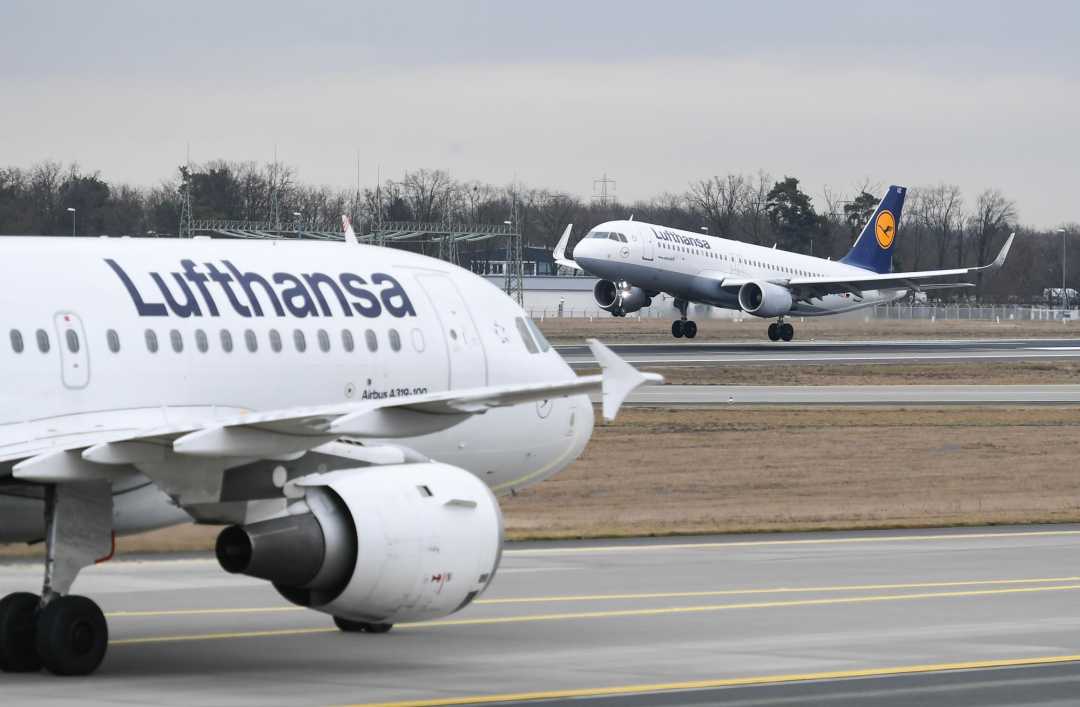 2022年1月17日,两架汉莎航空公司的飞机抵达德国法兰克福机场。新华社记者逯阳摄