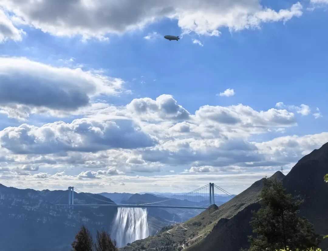 我国自主研制的载人飞艇“祥云”AS700与花江峡谷大桥硬核同框