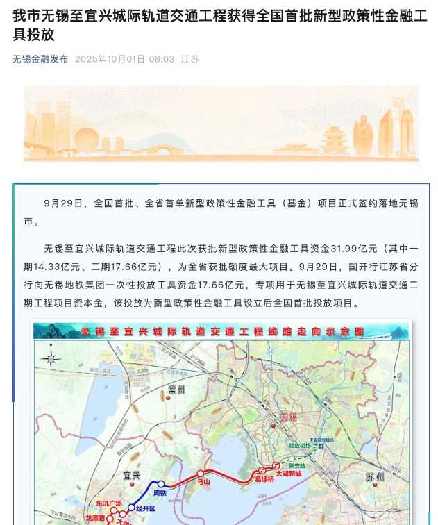 无锡至宜兴城际轨道交通工程此次获批新型政策性金融工具资金31.99亿元(其中一期14.33亿元、二期17.66亿元),为全省获批额度最大项目。9月29日,国开行江苏省分行向无锡地铁集团一次性投放工具资金17.66亿元,专项用于无锡至宜兴城际轨道交通二期工程项目资本金,该投放为新型政策性金融工具设立后全国首批投放项目。