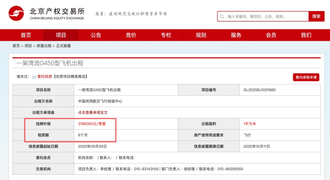 证券时报·e公司记者注意到,北京产权交易所近日挂出了一则湾流G450型飞机出租的信息,此飞机租赁市场动态备受关注。据挂牌信息,该资产租赁期为6个月,租金为319.83万元/季度,约合106.61万元/月,体现了公务机租赁市场的独特行情。