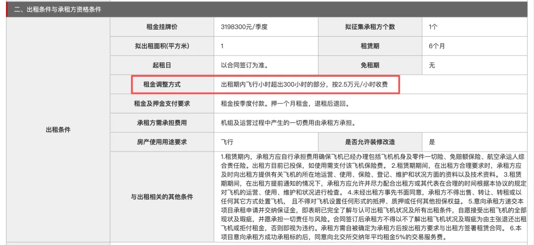 根据出租方的要求,承租人在出租期内使用的飞行小时为300小时(含),飞行小时超出300小时的部分,按2.5万元/小时收费。同时,承租人还需承担机组及运营过程中产生的一切费用。