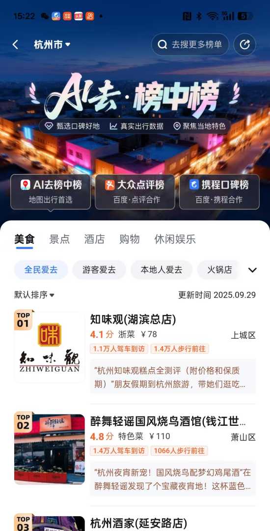 打开页面,三个榜单清晰可见:AI去榜中榜、大众点评榜(百度·点评合作)、携程口碑榜(百度·携程合作),形成横跨地图、本地服务、OTA 的联盟。