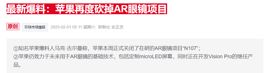 知情人士透露,苹果原本计划在2027年推出一款代号为“N100”的、较便宜的轻量版头显。但公司上周已在内部宣布,将把该项目的人手调配到智能眼镜研发上,以加速工作进度,抢占市场先机。