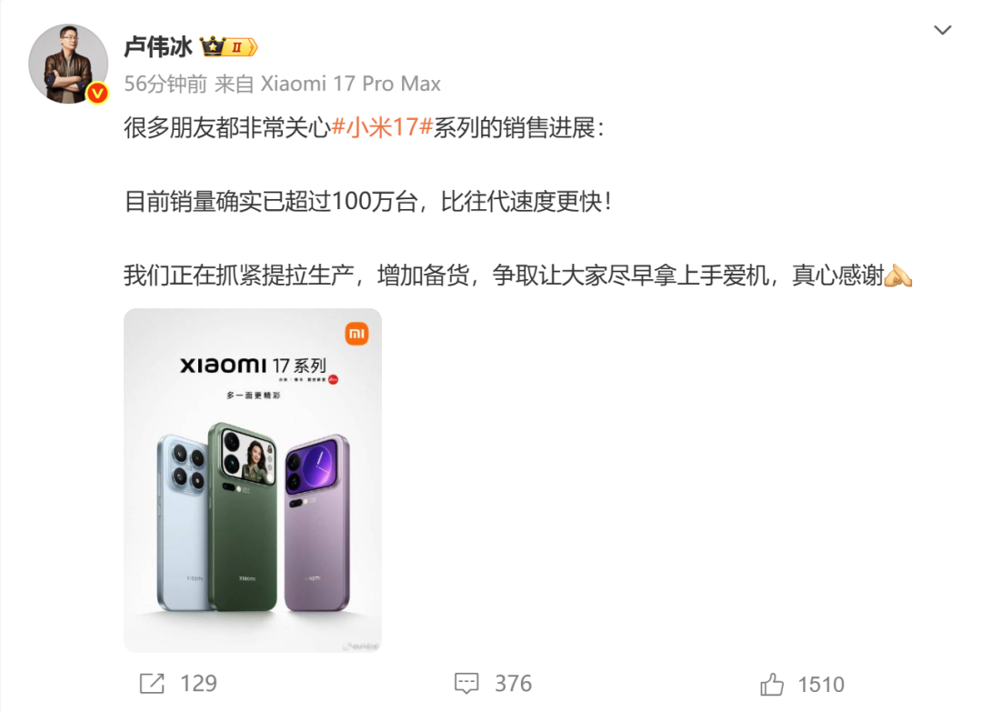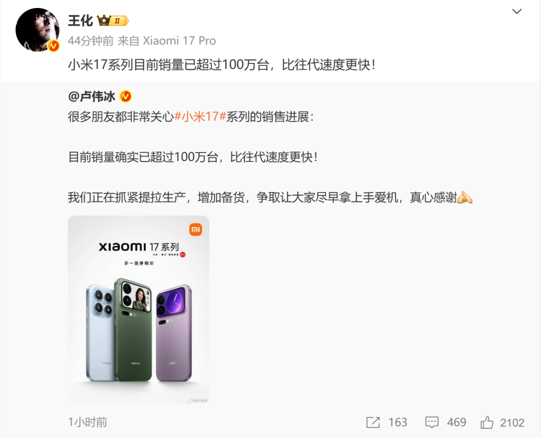 小米公关负责人王化转发卢伟冰微博并配文称,“小米17系列目前销量已超过100万台,比往代速度更快!”