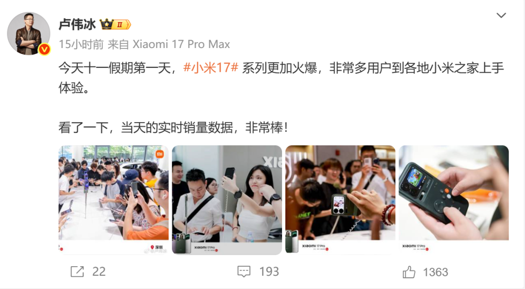 前一日,卢伟冰曾分享各地用户前往小米之家上手体验小米17系列手机的照片,并表示“实时销量数据非常棒”,市场反响热烈。
