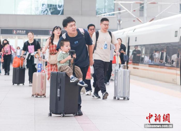 10月1日,国庆中秋假期首日,家长带着孩子在北京北站乘车。当日,中国铁路迎来国庆中秋假期客流最高峰,预计发送旅客2300万人次,计划加开旅客列车2106列,铁路客流创新高(交通出行关键词)。中新社记者贾天勇摄