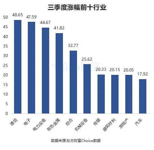从A股三季度的行业表现来看,也能感受到AI带来的科技狂热。东方财富Choice数据显示,三季度通信居行业涨幅榜首位,累计上涨48.65%。电子紧随其后,三季度上涨47.6%。个股而言,算力概念中的“易中天”“纪连海”等个股,在三季度也大放异彩。比如工业富联,在三季度大涨214.8%,最新市值达1.31万亿元,排在A股第9位。新易盛、中际旭创、天孚通信、寒武纪等也在三季度股价翻倍。