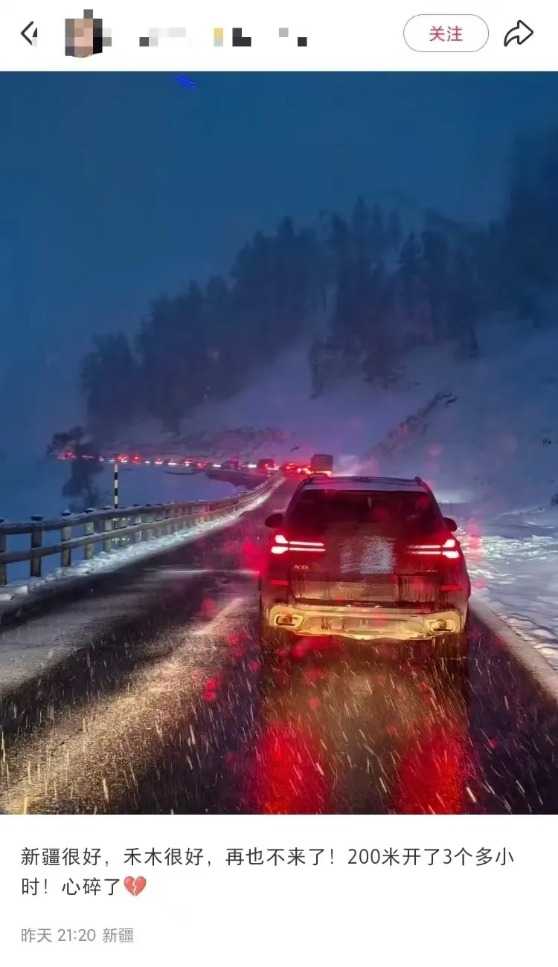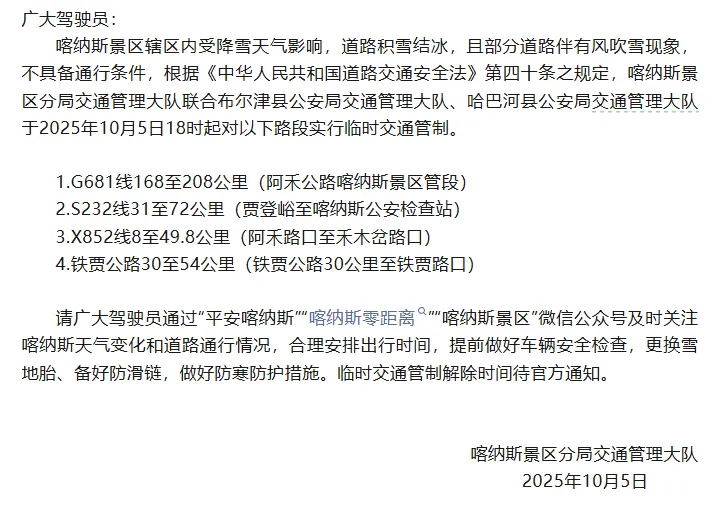 10月4日晚,多位游客发帖称,在新疆喀纳斯景区自驾旅行碰到大雪,堵在路上8个小时,5日凌晨三四点才下山。还有游客从禾木开车前往布尔津,花了近12个小时才住进宾馆。记者从当地交管部门了解到,目前前往喀纳斯景区、禾木的多条道路已经进行交通管制,具体通行时间还没有确定,目前仍有车辆堵在山上。喀纳斯景区方面表示,由于天气原因,区间车无法通行,景区没有开放。10月4日晚,堵在路上的车辆。受访者供图。10月1日,“平安喀纳斯”公众号发布公告称,对部分路段进行交通管制,10月2日道路积雪已清理完毕,达到安全通行条件,2日10时30分已对景区部分路段解除交通管制。但在昨天(10月4日)与今天(10月5日),“平安喀纳斯”公众号又分别发布了交通管制信息。