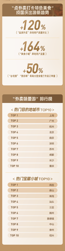 今年“双节”期间,上海、广州、杭州、北京、南京、深圳、苏州、成都、长沙、重庆为“外卖味蕾游”TOP10热门城市,南昌、佛山、珠海、汕头、三亚、扬州、景德镇、中山、泉州、绍兴为“外卖味蕾游”TOP10美食小城,这些城市餐饮消费各具特色。