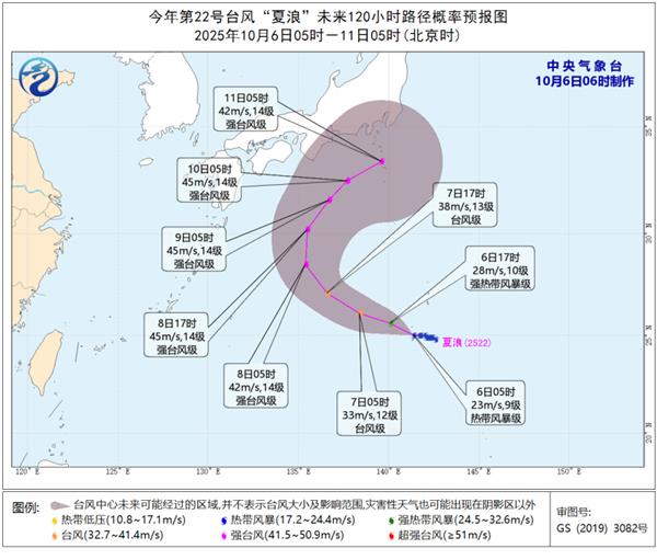 今年第22号台风“夏浪”的中心今天(10月6日)早上5点钟位于日本九州岛东南方向约1350公里的西北太平洋洋面上,中心位置精确至北纬25.0度、东经141.4度,台风动态显示其中心附近最大风力已达9级(23米/秒),中心最低气压为990百帕,七级风圈半径覆盖160~300公里范围,气象预警级别持续升级。