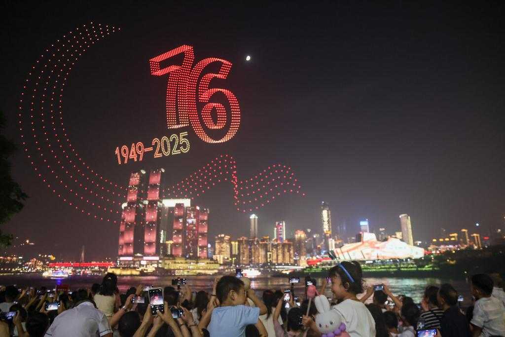 科技与文旅的融合,也为假日夜间消费增添别样色彩。10月1日晚,以“家国共庆”为主旋律的大型无人机灯光秀在重庆长江和嘉陵江上空上演。数千架无人机以天为幕,用璀璨的光影画卷为游客呈现了一场兼具科技感与人文温度的视觉盛宴。夜经济与科技融合,打造消费新体验。