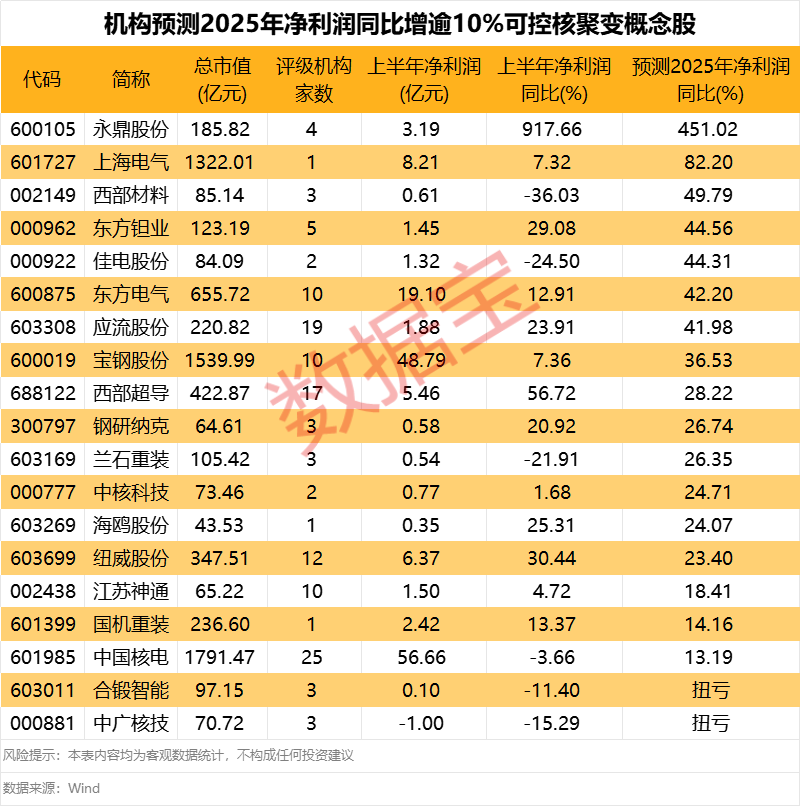根据机构对上市公司全年盈利的预测,永鼎股份2025年净利润有望同比增长451.02%;上海电气全年净利润有望同比增长82.2%;西部材料、东方钽业、佳电股份、东方电气和应流股份全年净利润有望同比增长40%以上。另外,合锻智能、中广核技全年净利润有望实现扭亏为盈。