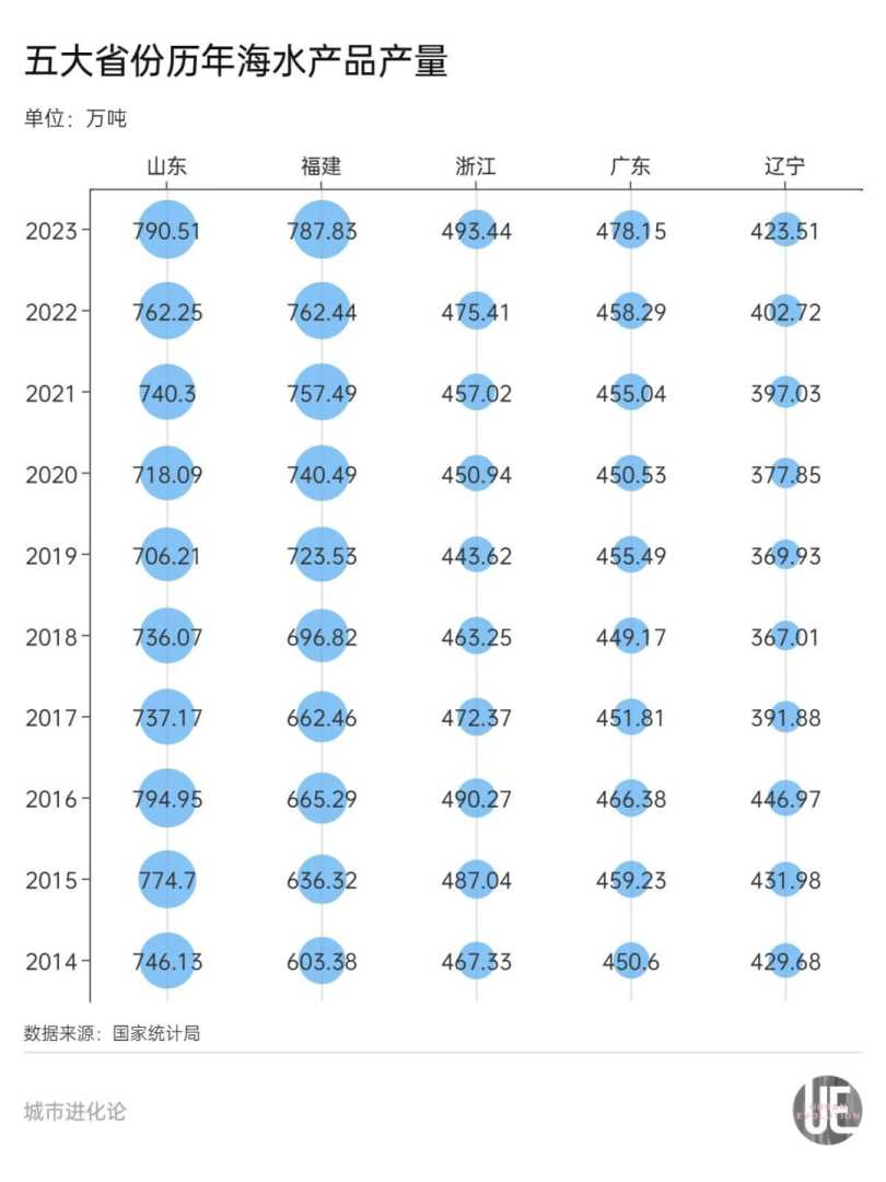 很多人首先想到的可能是广东。的确,早年不少内陆居民正是通过遍地开花的粤菜馆,完成了对海鲜的“初识”,但广东并非产量最高。根据国家统计局数据,山东2023年以790.51万吨的海水产品产量,稳居中国海鲜产量榜首,成为真正的“海鲜大省”。