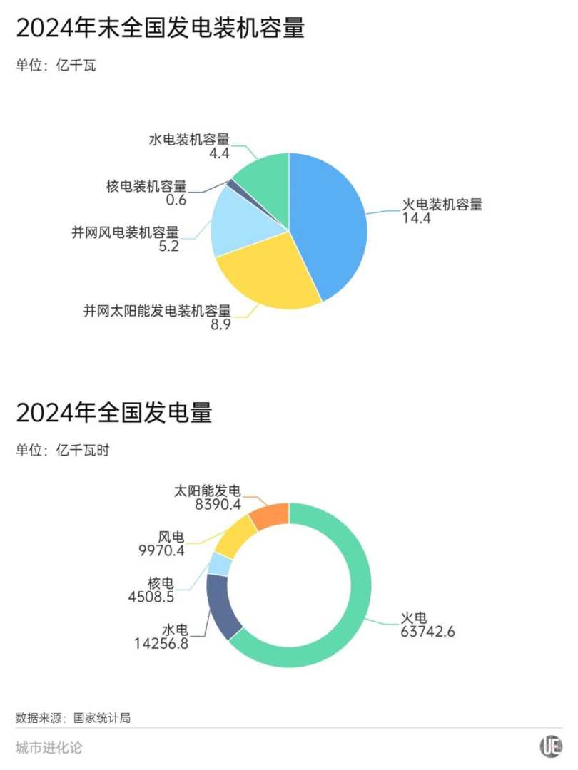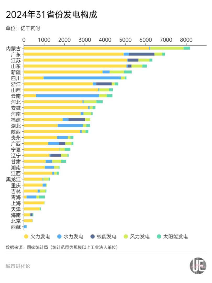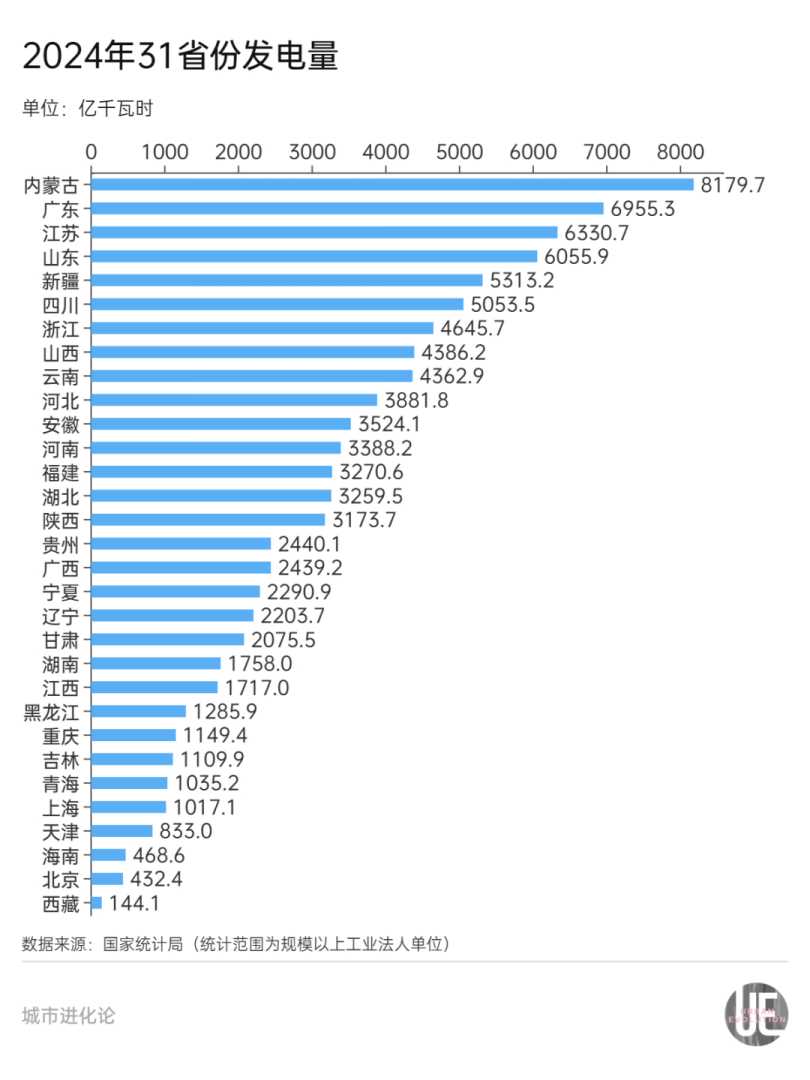 如今,中国每10度发电中就有4度来自清洁能源,区域电力格局呈现新特点。首先不得不提的是内蒙古,2024年内蒙古全年发电量达到8179.7亿千瓦时,全国占比8.6%,居全国第一。单项表现上,它不仅火电、风电均领跑全国,在太阳能发电领域也仅次于新疆,居全国第二,从传统能源到新能源,内蒙古在多个电力赛道都站上了第一梯队。