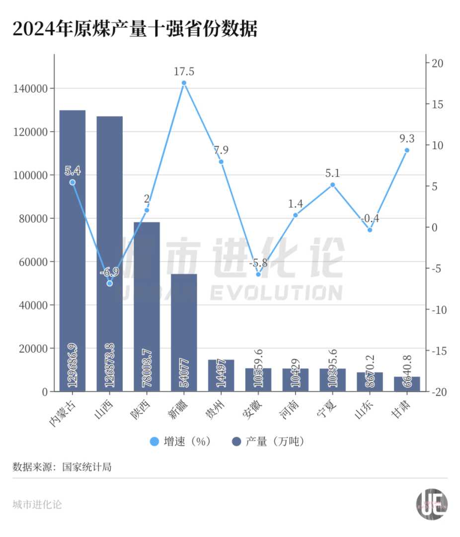国家统计局数据显示,2024年,内蒙古和山西原煤产量分别为12.97亿吨、12.69亿吨,分别占全国产量的27.25%、26.66%,一起贡献超“半壁江山”。今年前8月,两个省份原煤产量分别为8.40亿吨、8.63亿吨,山西再度反超内蒙古,有望在今年全年打赢一场翻身仗。