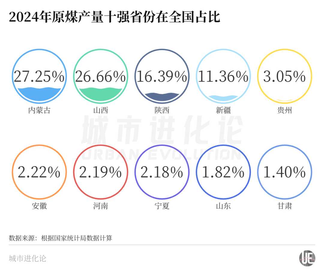 不只是这两个声名在外的“煤老大”,2024年陕西、新疆、贵州原煤产量分别为7.80亿吨、5.41亿吨、1.45亿吨,占全国的比重分别为16.39%、11.36%、3.05%,也是全国五大煤炭省份。