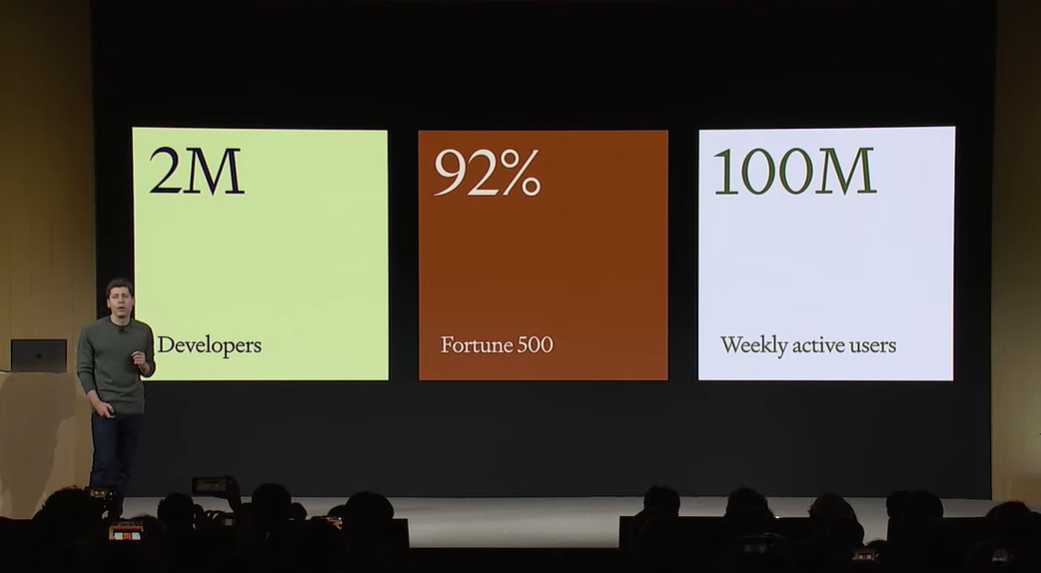 大会伊始,奥特曼简要概述了公司过去一年的显著成就,特别强调了今年3月发布的GPT-4,至今仍是全球顶尖的AI大模型。目前,已有200万开发者利用OpenAI的API在全球范围内提供多样化服务;92%的财富500强企业正借助OpenAI的产品构建服务,而ChatGPT的周活跃用户数更是突破了1亿大关。