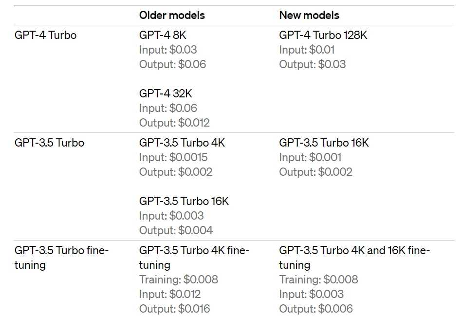 在定价方面,GPT-4 Turbo的价格远低于GPT-4,输入Token价格仅为三分之一,输出Token价格为一半。同时,GPT-3 Turbo 16K模型的价格也有所调整。