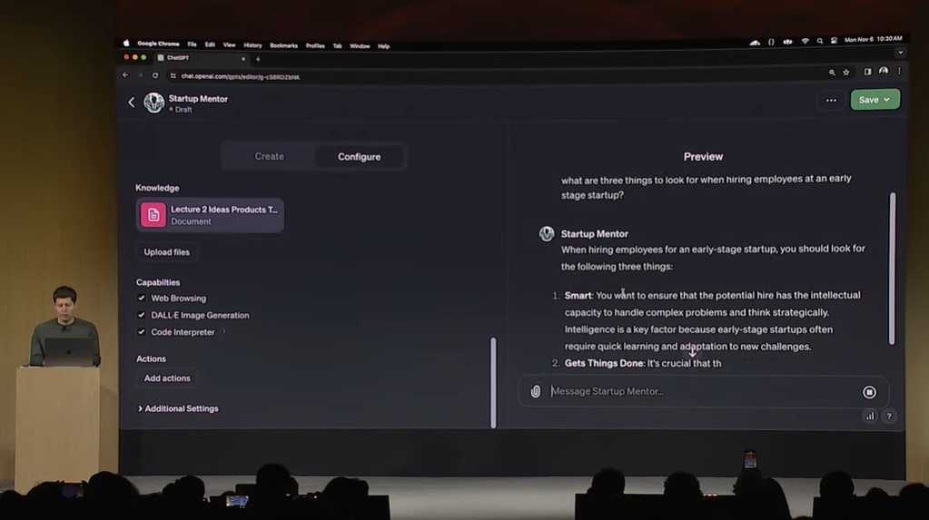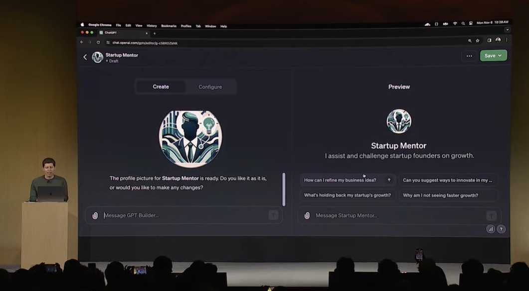 随后,GPTs惊艳登场,用户可通过自定义指令、拓展知识边界和下达行动命令,构建自己的GPT,并对外发布。奥特曼现场演示了如何通过聊天搭建一个GPT,并展示了其强大的功能。