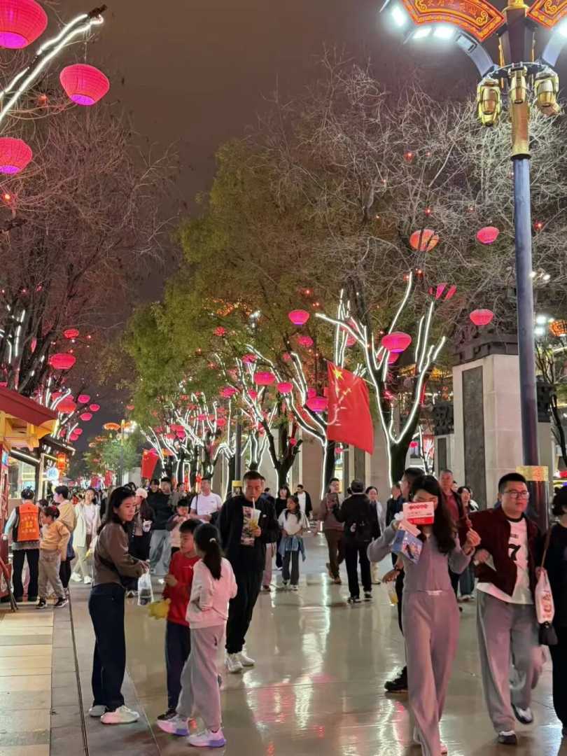 夜幕降临,大唐不夜城灯火璀璨,宛如一条金色游龙蜿蜒在西安的夜空下。身穿汉服、手持鱼灯的游客穿梭在仿古街巷,与演员扮演的“李白”吟诗唱和,相映成趣,再现了盛唐市井的繁华景象,沉浸式体验吸引游客深度参与。