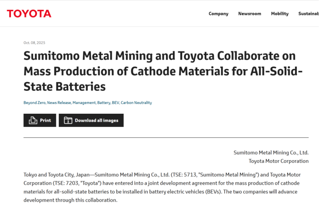 10月8日,丰田汽车全球官网发布消息称,住友金属矿山株式会社(以下简称“住友金属矿山”)与丰田汽车就量产用于纯电动汽车(BEV)的全固态电池正极材料达成合作协议。双方将通过此次合作推进研发进程,加速电动汽车电池技术突破。丰田汽车还在文内重申,计划于2027年至2028年间推出搭载全固态电池的纯电动汽车。