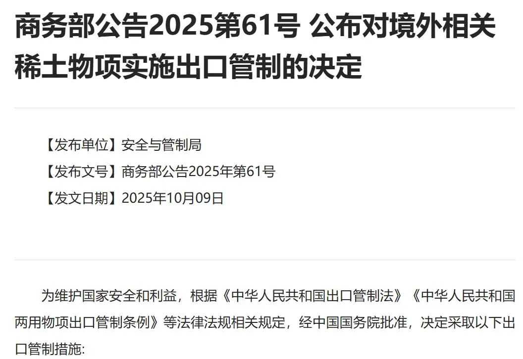 10月9日商务部公告,为维护国家安全和利益,决定对稀土相关技术等物项实施出口管制,未经许可不得出口,涉及稀土开采、冶炼等多项技术及其载体。