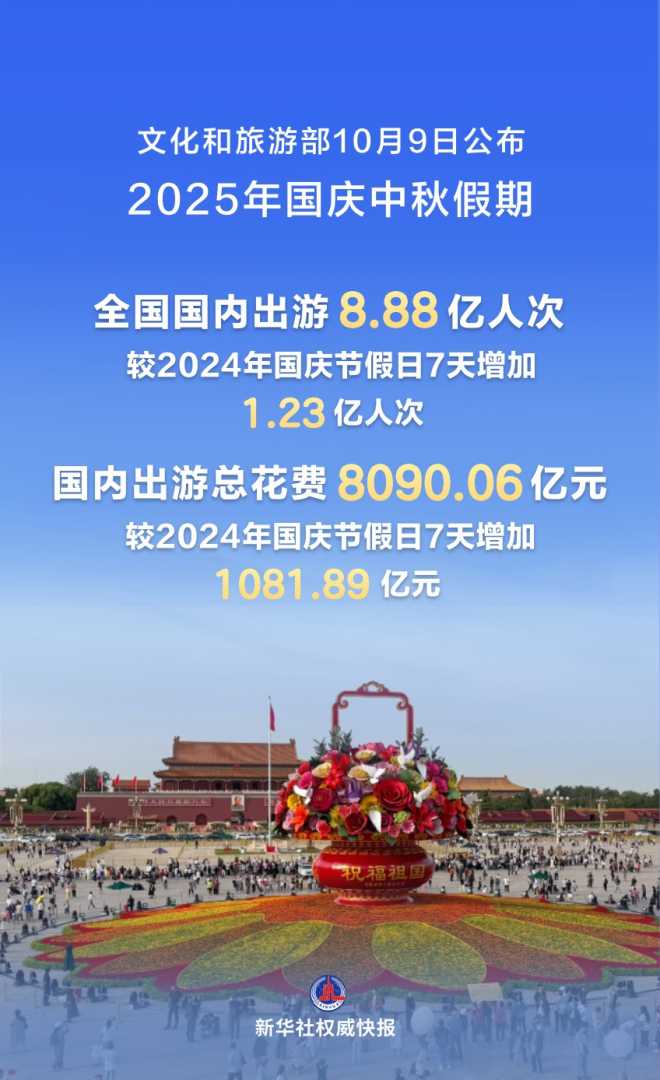 文化和旅游部10月9日公布2025年国庆中秋假期文化和旅游市场情况,这一数据揭示了旅游市场的强劲复苏。经测算,假日8天,全国国内出游8.88亿人次,较2024年国庆节假日7天增加1.23亿人次,旅游人次显著增长;国内出游总花费8090.06亿元,较2024年国庆节假日7天增加1081.89亿元,消费能力持续提升。