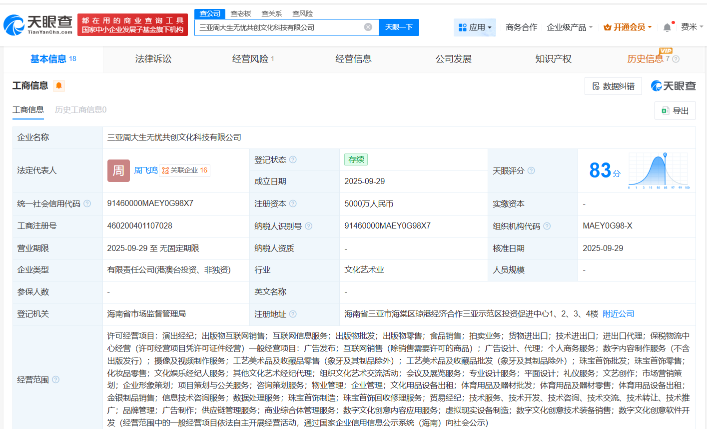 南方财经10月9日电,天眼查App显示,近日,三亚周大生无忧共创文化科技有限公司正式成立,法定代表人为周飞鸣,注册资本高达5000万人民币。该公司经营范围广泛,涵盖演出经纪、出版物互联网销售及互联网信息服务等多个领域,由周大生(002867)、无忧传媒集团有限公司、海南金生无忧文化产业投资中心(有限合伙)以及周飞鸣共同持股。据媒体深入报道,此前,周大生已正式启动与无忧传媒的紧密战略合作,双方携手成立上述合资公司,旨在共同推动珠宝行业线上业务的蓬勃增长,为行业注入新活力。