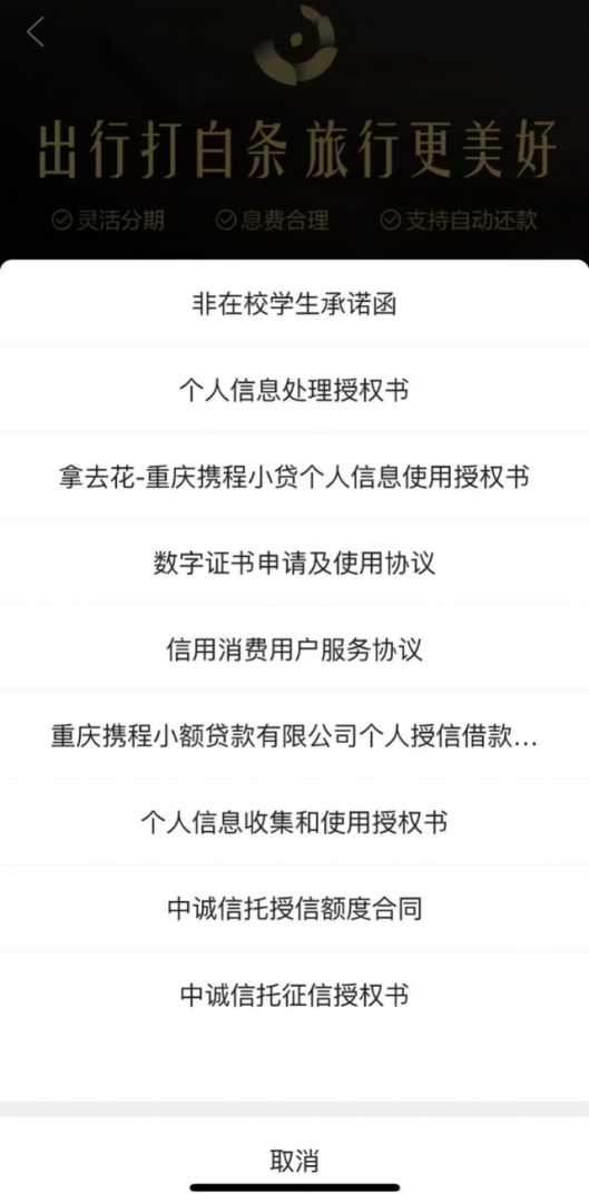 无独有偶,如上图,“拿去花”勾选“阅读并同意相关协议、授权书、承诺函”时,实际上一次性同意了《非在校学生承诺函》《中诚信托授信额度合同》等九份文件。