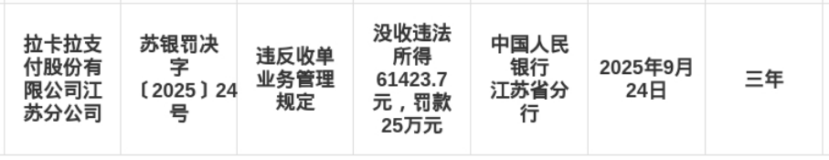 罚单显示,拉卡拉支付股份有限公司江苏分公司的主要违法违规事实(案由)为:违反收单业务管理规定。在支付行业规范发展背景下,此类违规行为凸显合规管理重要性。
