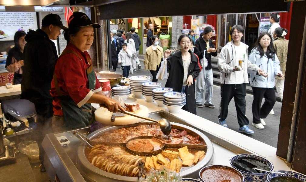 10月6日,游客在北京烟袋斜街品尝美食。新华社记者李欣摄