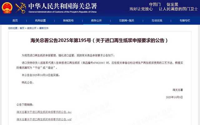 海关总署2025年第195号公告(关于进口再生纸浆申报要求的公告)再次强调了监管的重要性。