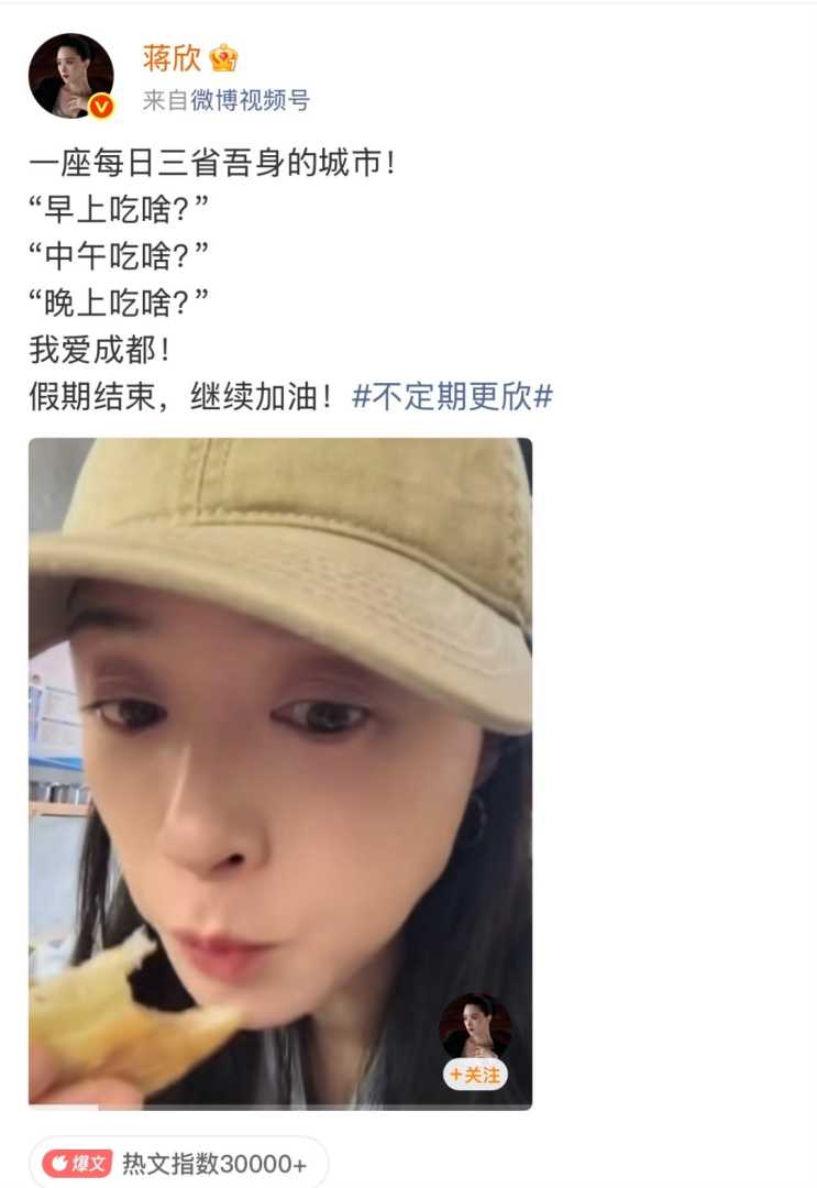 10月8日,女演员蒋欣晒出在成都的假期日常,称呼成都是“一座每日三省吾身的城市”,还直言“我爱成都!”视频中,蒋欣晒出了自己在成都享受各种美食的视频,种类丰富,菜品都空盘了,而炫完美食之后,蒋欣还去游泳锻炼。明星效应进一步提升了成都文旅市场的知名度。