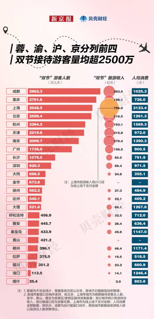 交通运输部数据显示,“双节”期间全社会跨区域人员流动量累计24.33亿人次,日均3.04亿人次,比2024年同期日均同比增长6.3%,创下历史新高。根据各地公开披露的旅游数据,新京报贝壳财经记者制作了主要热门城市的“双节”成绩单。其中,成都、重庆、上海、北京分列前四,接待游客量均超2500万人次,文旅消费成为经济增长新引擎。