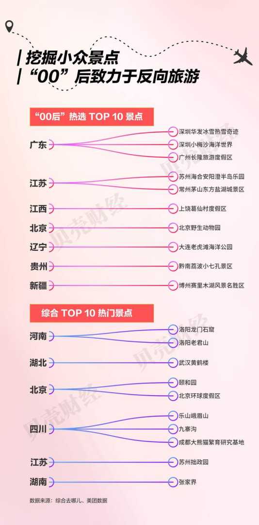不过,“反向旅游”也出现了新的热度分化:有人成功探索到真正冷门的宝藏景点,也有人不约而同地涌向人气“黑马”目的地,例如假期订单量同比增长60%的景德镇,以及登顶全国县域酒店预订量榜首的九寨沟县。此外,相比于往年常见的“特种兵式”旅游,这届年轻人开启了省心省力的跟团游、包车游等躺平玩法,加上近年兴起的追星游、赛事游,共同推动多地旅游消费呈现强劲增长,文旅市场创新不断。