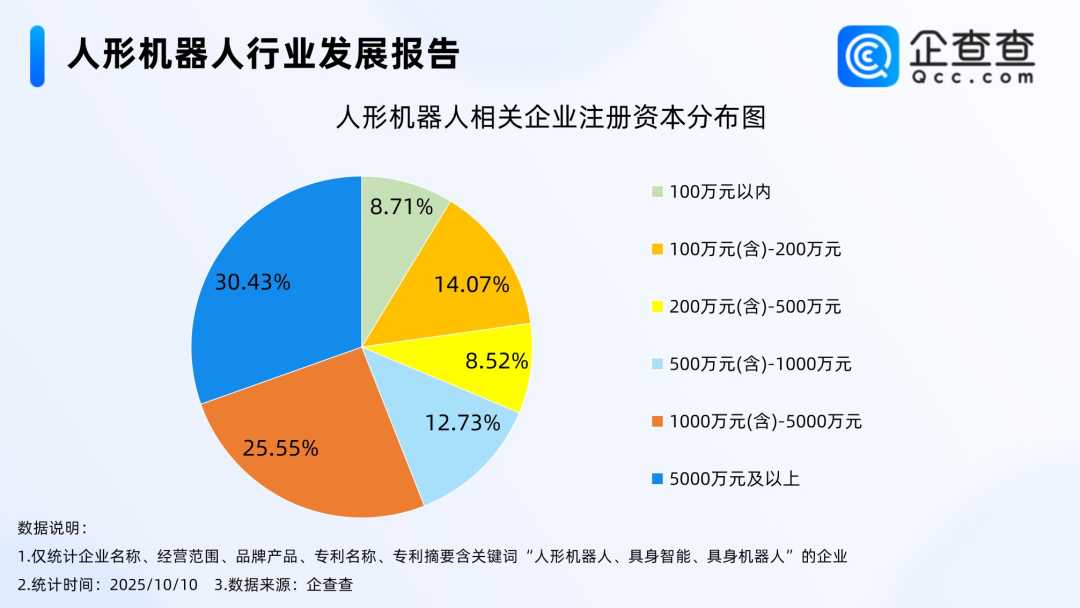 在注册资本方面,人形机器人相关企业多为资金密集型企业,注册资本千万级及以上的企业占比过半。其中,注册资本在5000万元及以上的相关企业占比最高,达到30.43%,这进一步证明了人形机器人市场的吸引力和潜力。随着技术的不断进步和市场的逐步成熟,人形机器人产业有望迎来更加广阔的发展前景。