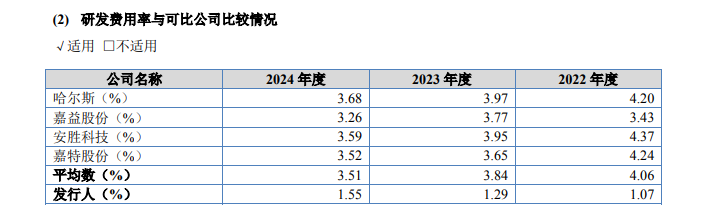 如前所述,与同行相比,同富股份研发占比并不高,那到底差多少呢?2022-2024年,同富股份研发投入金额分别为2108万元、2725万元和4291万元,占同期营收的比例分别为1.1%、1.3%和1.6%。公司研发费用比例逐期上升,但仍未超过2%。招股书中,同富股份列举了4家竞争对手,4家同行没有一家研发费用占比低于3%。比如龙头哈尔斯,近三年研发费用占比都超过了3.5%,或者说,基本在4%上下。其他3家公司也大同小异,在研发费用上并未吝啬。2024年,4家同行公司平均研发费用率超过了3.5%,这已经是三年来的最低水平了,向前两年则在4%左右。与之相比,同富股份研发投入占比远不及平均值的一半。研发投入偏低,同富股份毛利率也落后哈尔斯等同行。2025年上半年,公司毛利率为24.7%,哈尔斯毛利率为28.7%,同富股份落后竞争对手毛利率4个百分点。从全年看,2022-2024年同富股份毛利率基本在25%上下,哈尔斯则在30%左右。