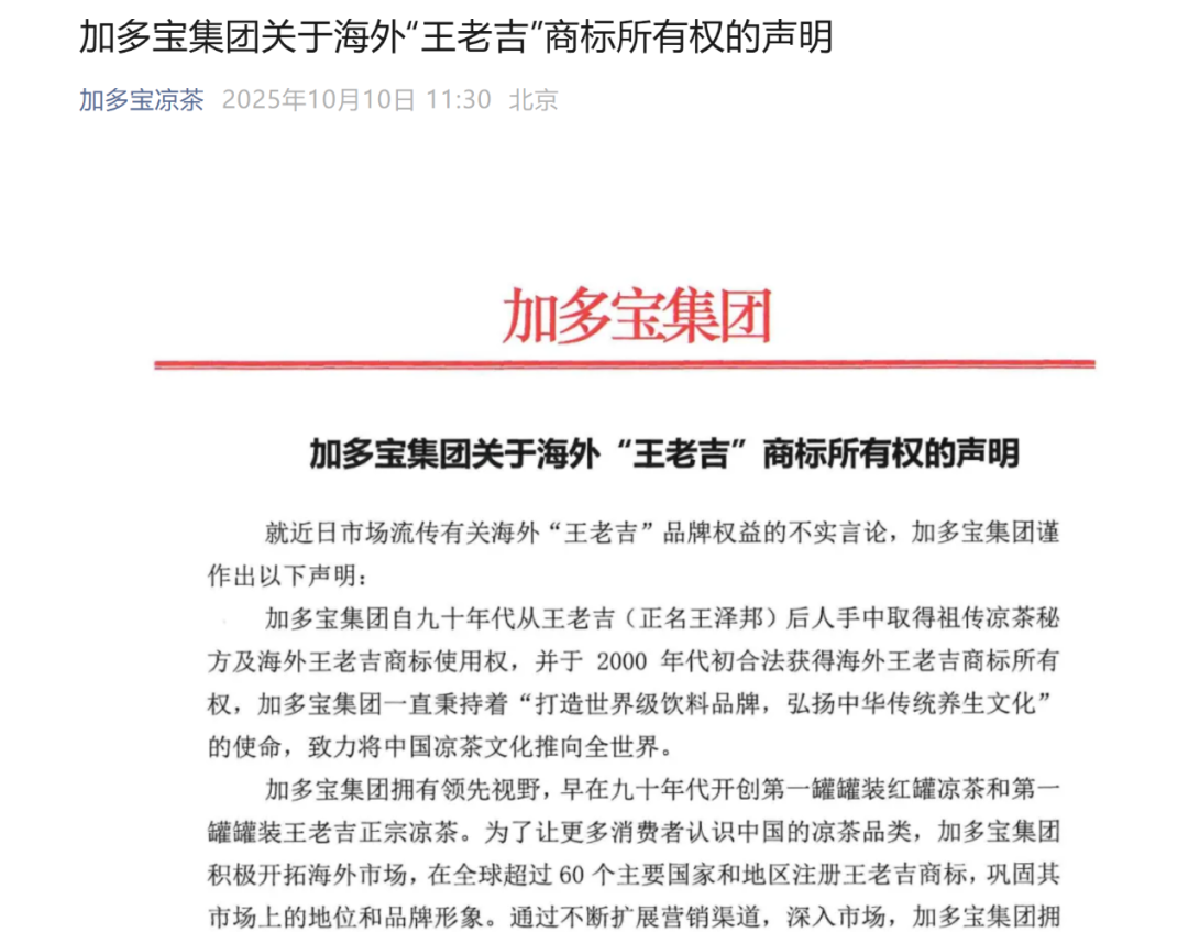 而早在9月30日,王老吉发表声明称,加多宝通过海外离岸关联公司万捷有限公司在全球60余个国家和地区进行恶意注册。王老吉强调,截至2025年9月30日,“王老吉”商标权利人白云山(证券代码:600332)和王老吉已在全球100多个国家和地区完成“王老吉”“WALOVI”等系列商标注册。