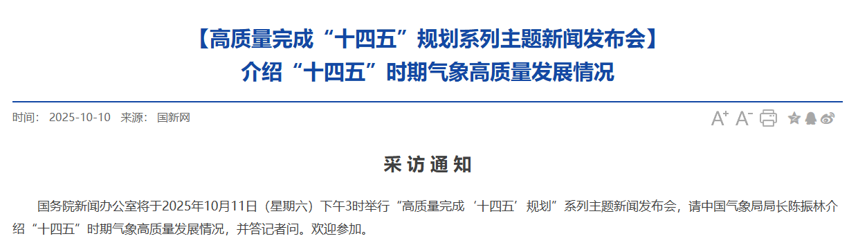 国务院新闻办公室将于2025年10月11日(星期六)下午3时再度举行“高质量完成‘十四五’规划”系列主题新闻发布会,中国气象局局长陈振林将全面介绍“十四五”时期气象高质量发展情况,并就相关问题答记者问,为气象领域发展指明方向。