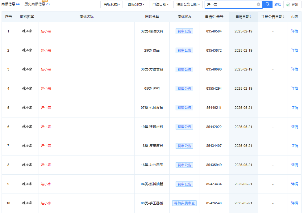 红星资本局通过天眼查App注意到,今年以来,宏胜集团已申请数十个“娃小宗”相关商标,国际分类广泛,包括啤酒饮料、食品、方便食品和医药等,部分商标已通过初审,部分商标还在等待实质审查,品牌扩张步伐明显加快。